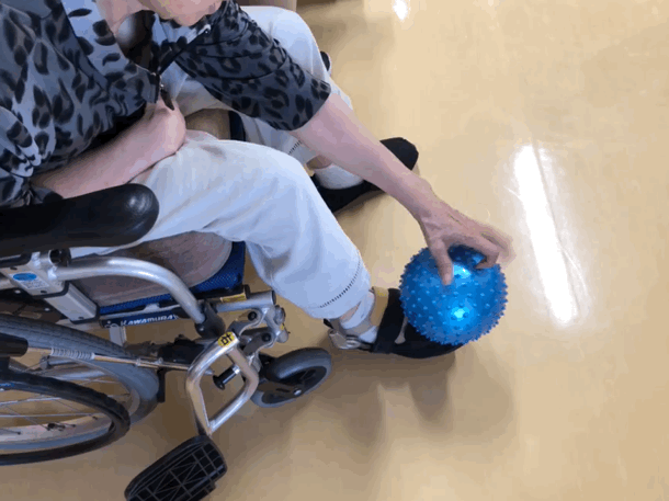 足を台にして指先でボールを上から下まで転がし、往復させます。