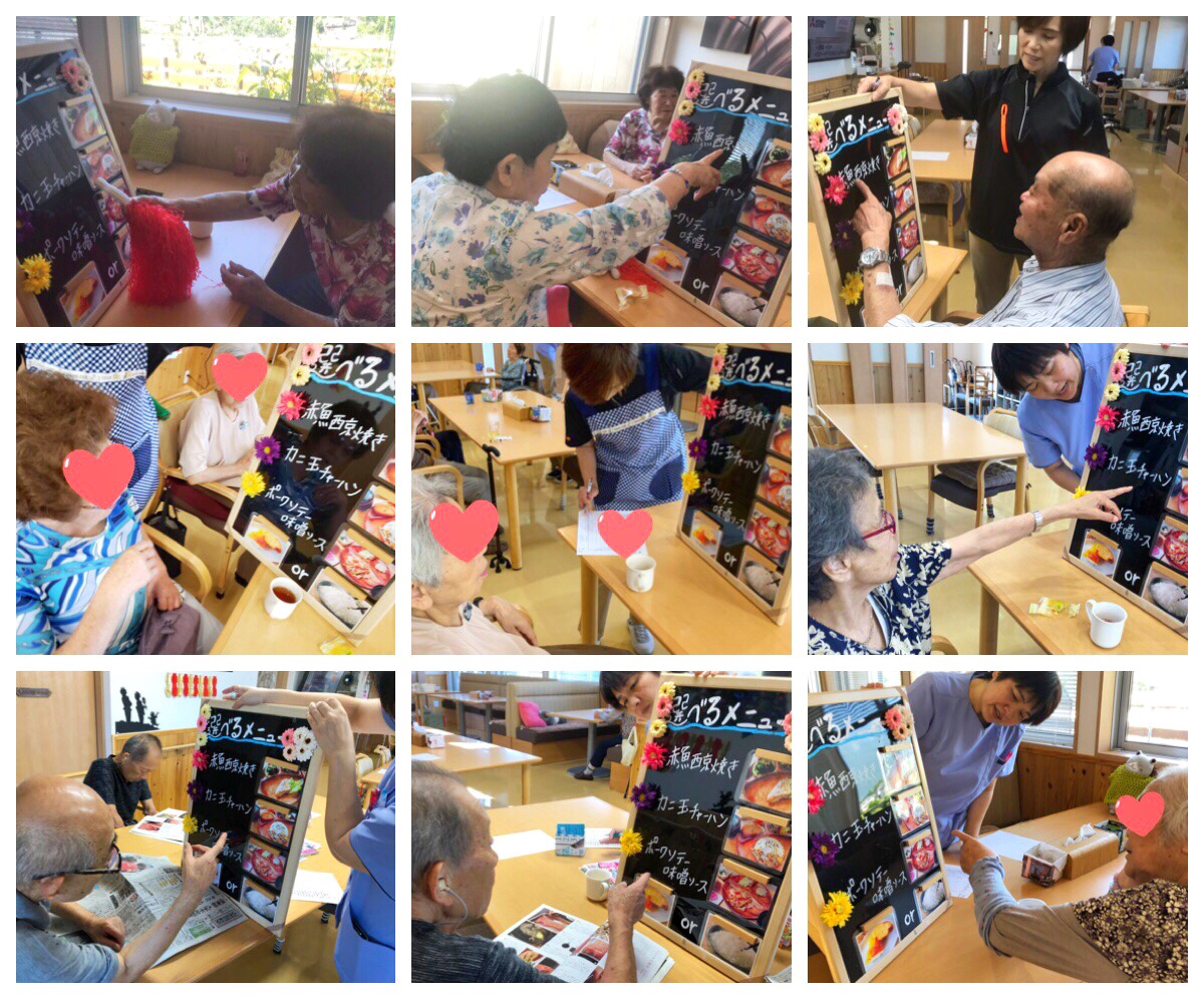 ※個人のニーズに合わせた選択制レクリエーション。過去または現在の趣味、仕事などを活かした内容や、自分の好きな事をする時間。お客様同士のコミュニケーションやスタッフとお客様が「ふれあう」とても大切な時間です。