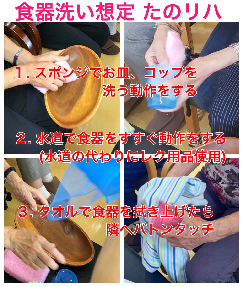 今日は 主婦の日常生活に欠かせない 「食器洗い動作」を取り入れた たのリハです。 一連の動作暗記もありますので 「生活動作(リハ)」と「動作暗記(脳トレ)」の ダブルタスク(2重課題) となります。 |