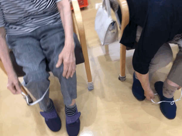 ※ゴム紐を使い、親指と人差し指だけで衣類着脱に必要なボタンを留める動作や、ゴム紐を上から下、下から上とくぐり着脱に必要な動作をおこないます。
