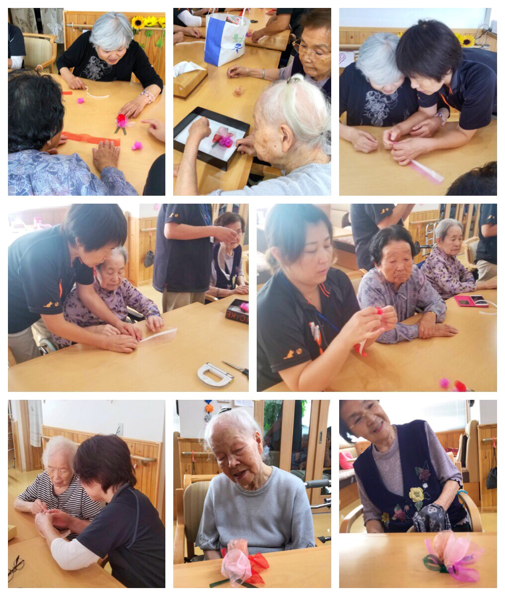 物づくりレク オーガンジーリボンのフラワーコサージュ