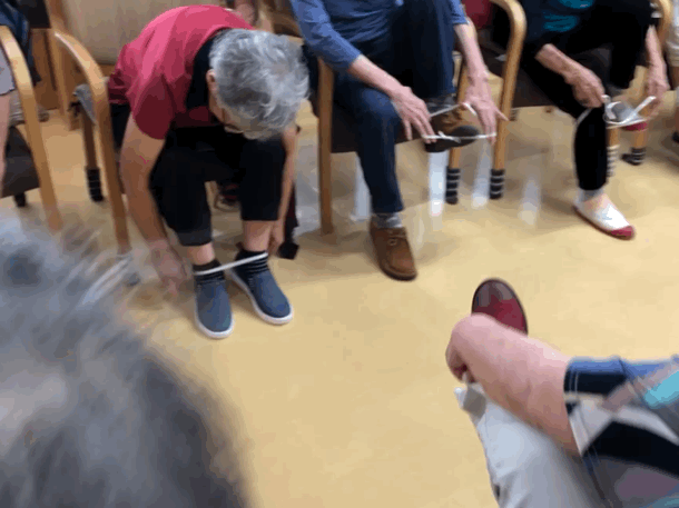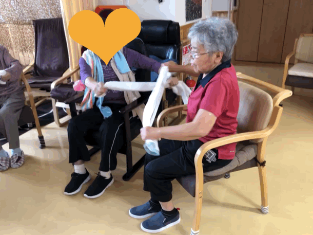 ゴム紐を使った生活リハを数パターンおこないます!