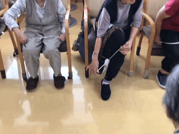 ※ゴム紐を使い、親指と人差し指だけで衣類着脱に必要なボタンを留める動作や、ゴム紐を上から下、下から上とくぐり着脱に必要な動作をおこないます。