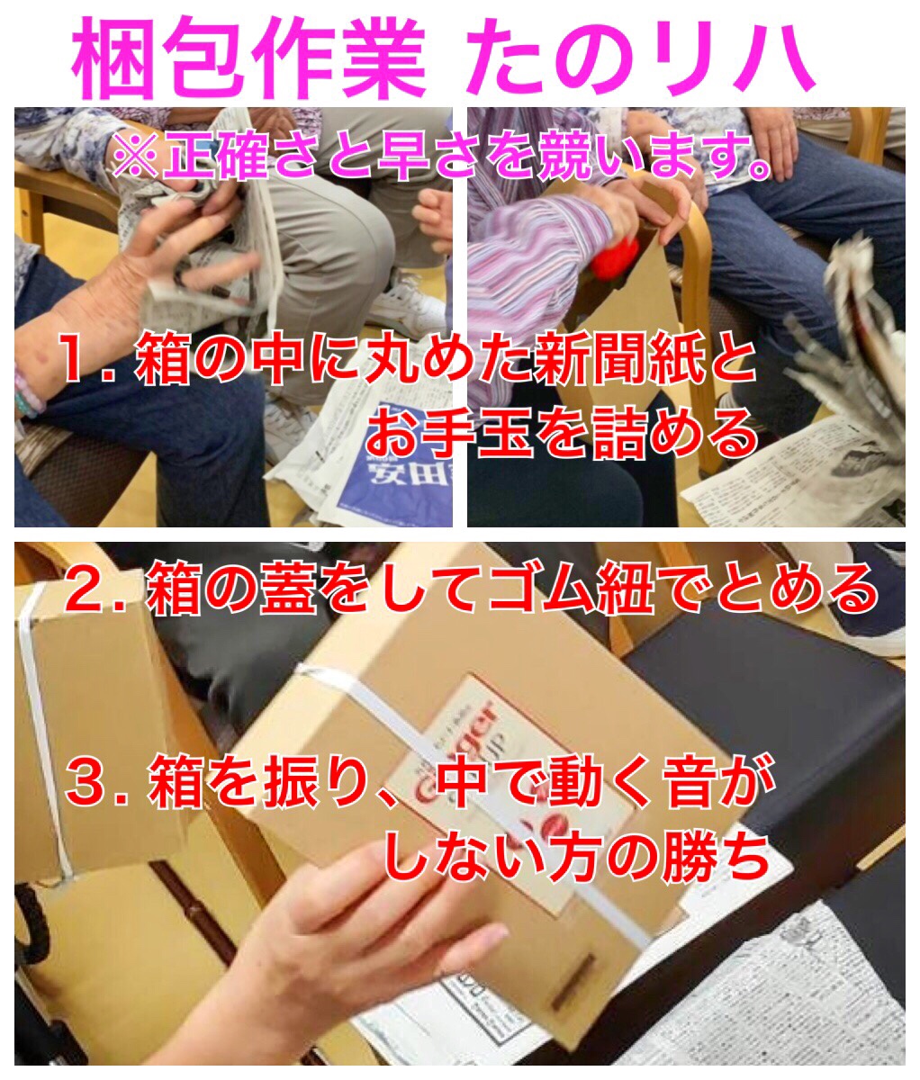 今日は 「速さ」と「正確さ」を両立させて 梱包作業をおこなう たのリハです。 「生活動作(リハ)」と 「動作暗記(脳トレ)」の ダブルタスク(2重課題)となります。 |