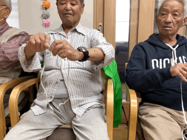 ※ゴム紐を使い、親指と人差し指だけで衣類着脱に必要なボタンを留める動作や、ゴム紐を上から下、下から上とくぐり着脱に必要な動作をおこないます。