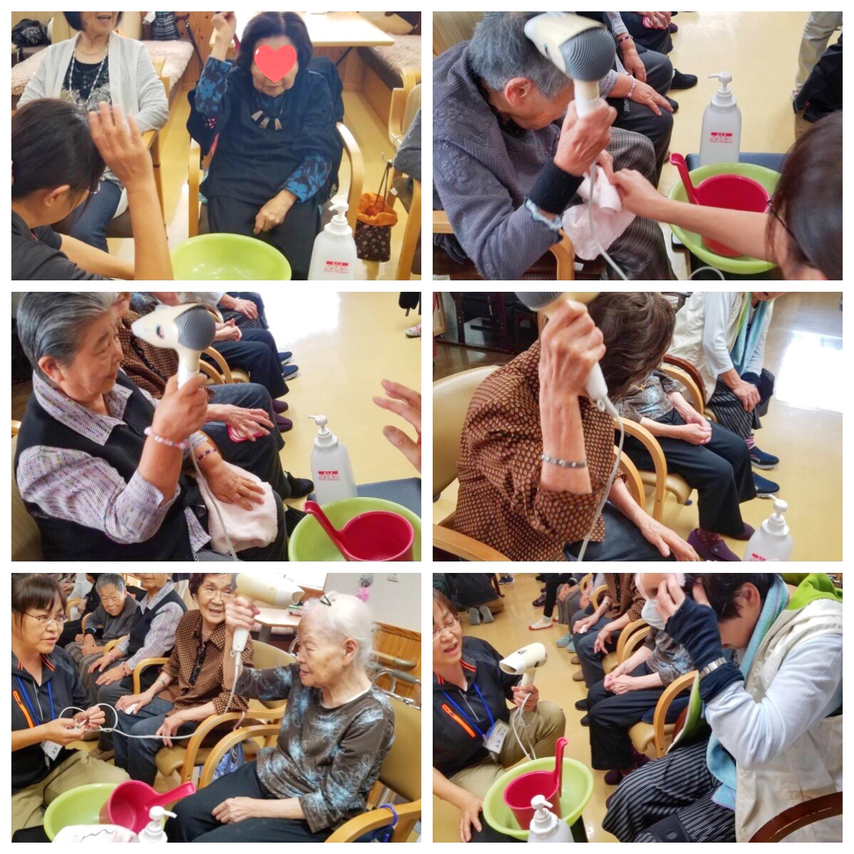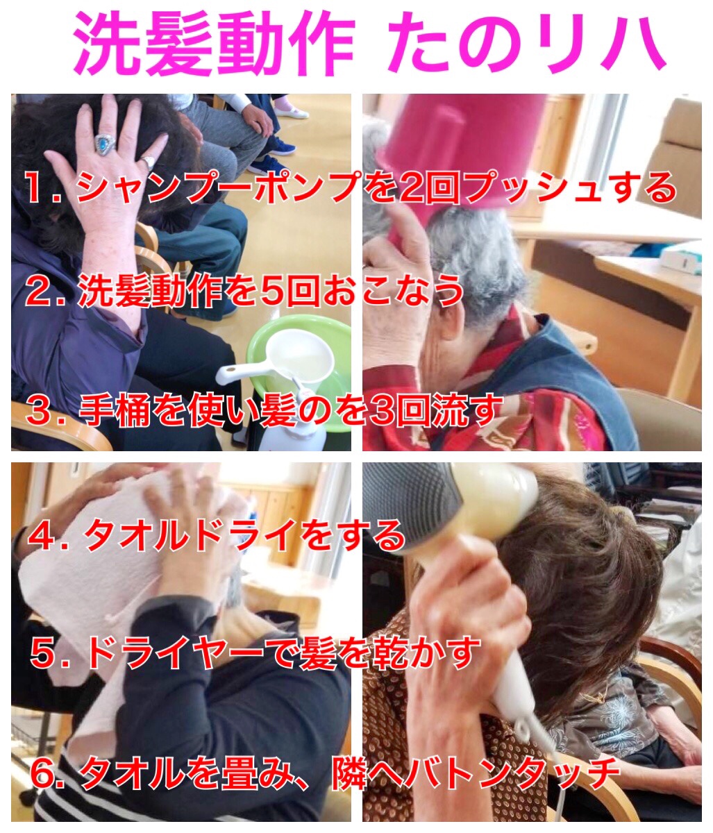 今日は 生活リハにもなる 洗髪動作の一連の流れを取り入れた たのリハです。 「生活動作(リハ)」と 「動作暗記(脳トレ)」の ダブルタスク(2重課題)となります。 |