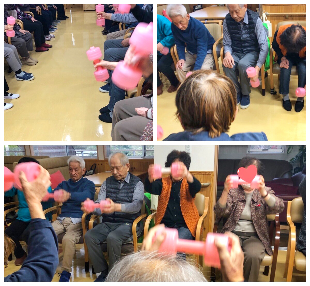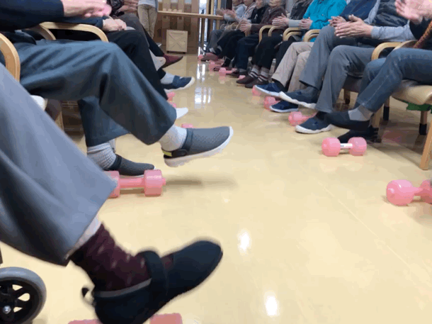 ※オモリを持って 歌いながら!楽しみながら!低負荷高反復でおこないます。歌いながらおこなうことで呼吸器訓練にもなり、且つ、楽しみながら効率効果的なリハビリがおこなえます。