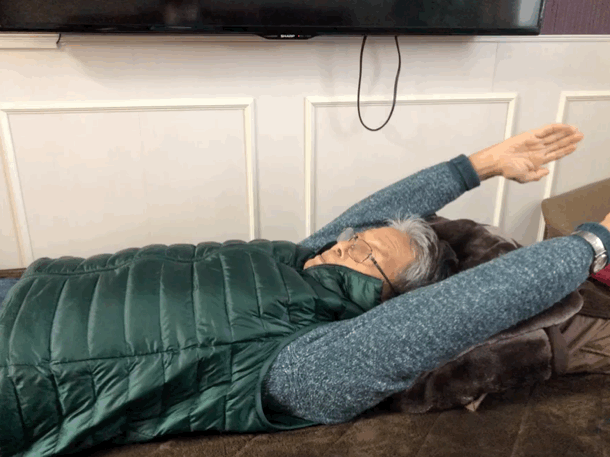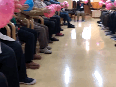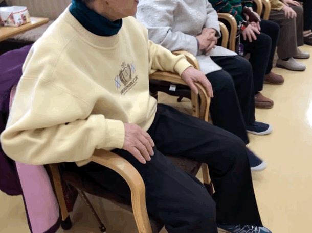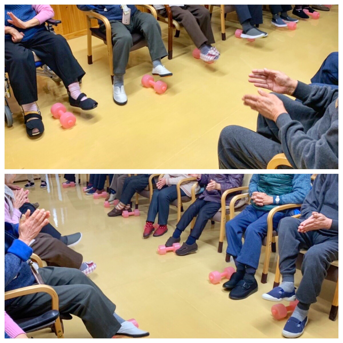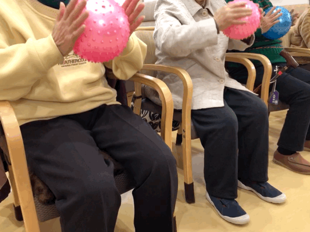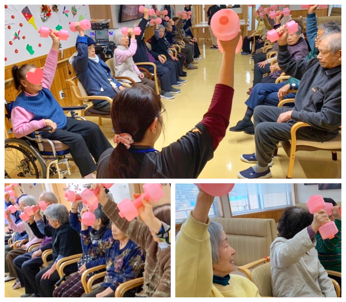 ※オモリを持って 歌いながら!楽しみながら!低負荷高反復でおこないます。歌いながらおこなうことで呼吸器訓練にもなり、且つ、楽しみながら効率効果的なリハビリがおこなえます。