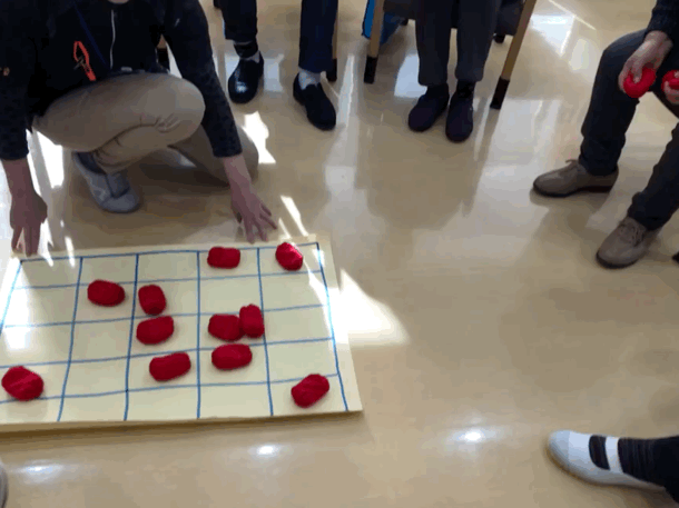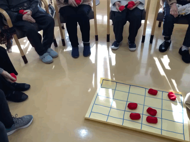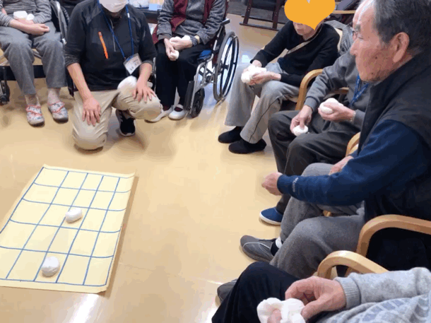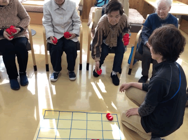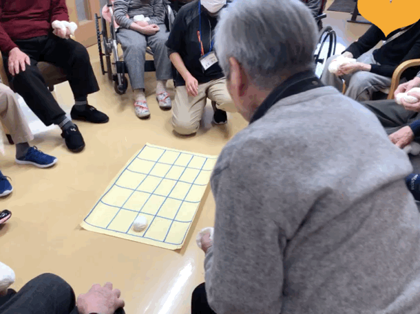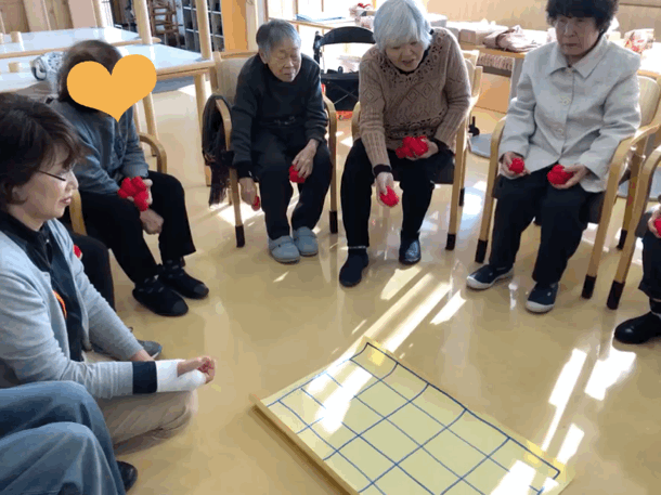 一人2つずつお手玉を投げてより多くビンゴさせる。