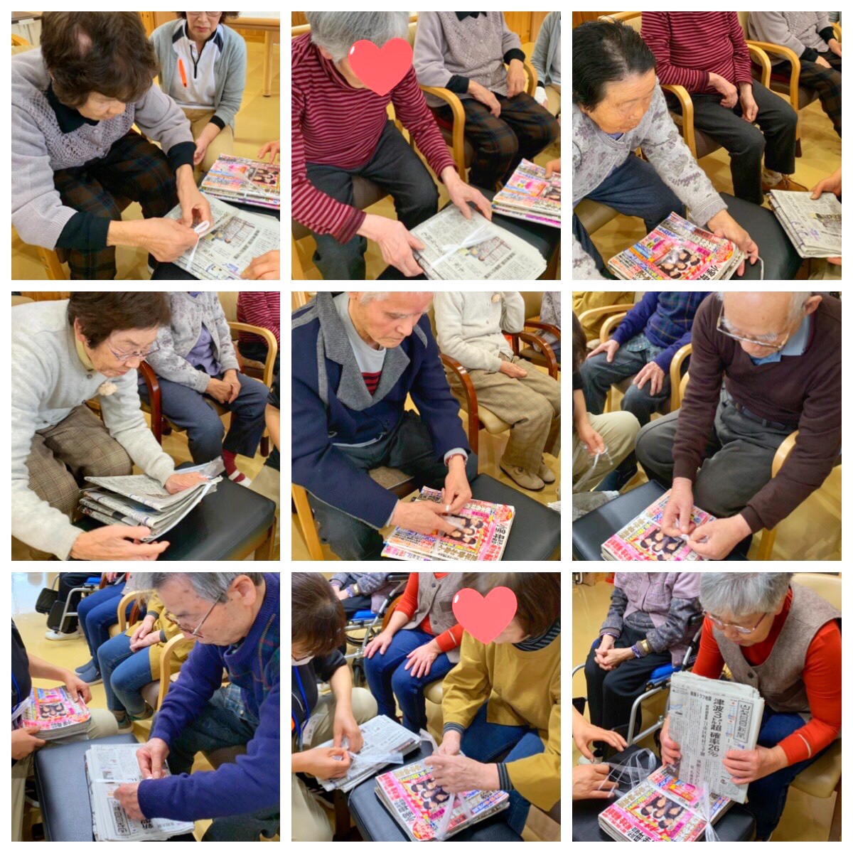 今日は 主婦の日常生活で 欠かせない 雑誌を まとめる 動作を取り入れた たのリハです。 「生活動作(リハ)」と「動作暗記(脳トレ)」の ダブルタスク(2重課題) となります。 |