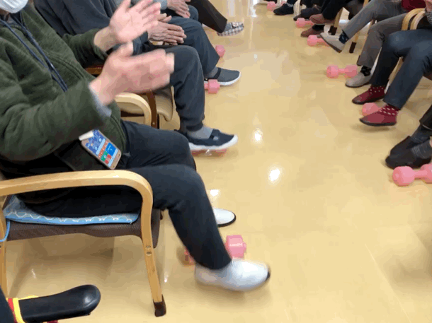 ※オモリを持って 歌いながら!楽しみながら!低負荷高反復でおこないます。歌いながらおこなうことで呼吸器訓練にもなり、且つ、楽しみながら効率効果的なリハビリがおこなえます。