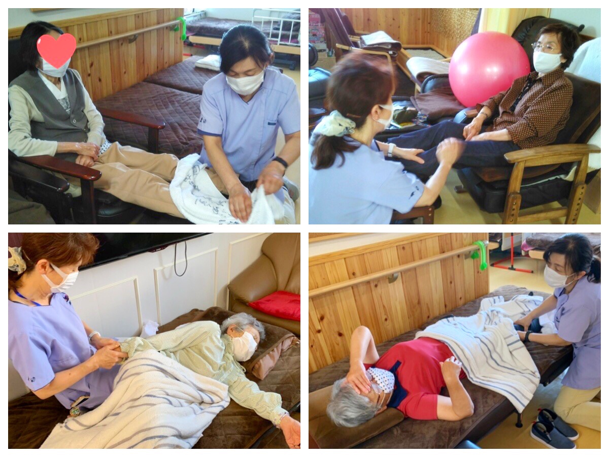 ※機能訓練前に硬直した筋肉をほぐす為、当センターではマッサージをおこなっております。機械では味わえない感触がとても大好評です。『やっぱ人の手だよね』とのお声が上がっております。