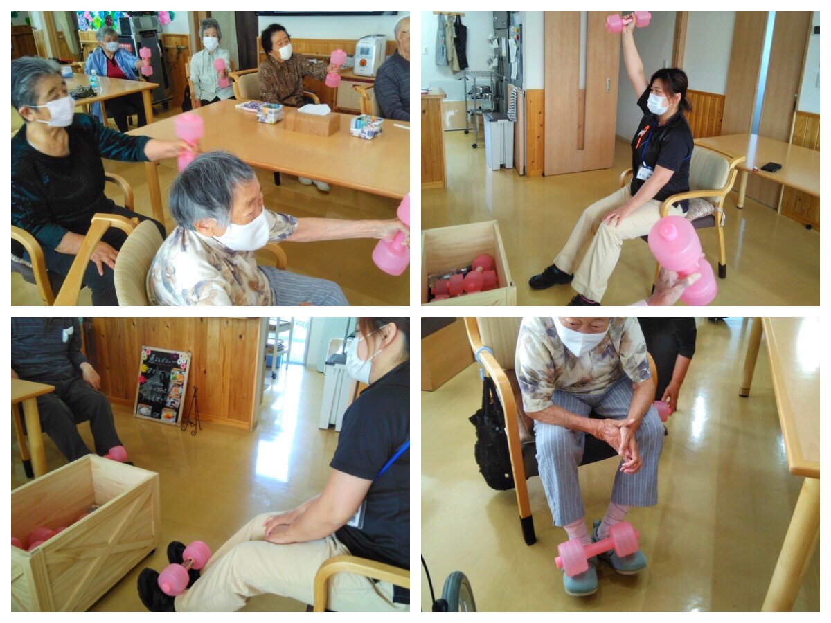 ※オモリを持って 歌いながら!楽しみながら!低負荷高反復でおこないます。歌いながらおこなうことで呼吸器訓練にもなり、且つ、楽しみながら効率効果的なリハビリがおこなえます。