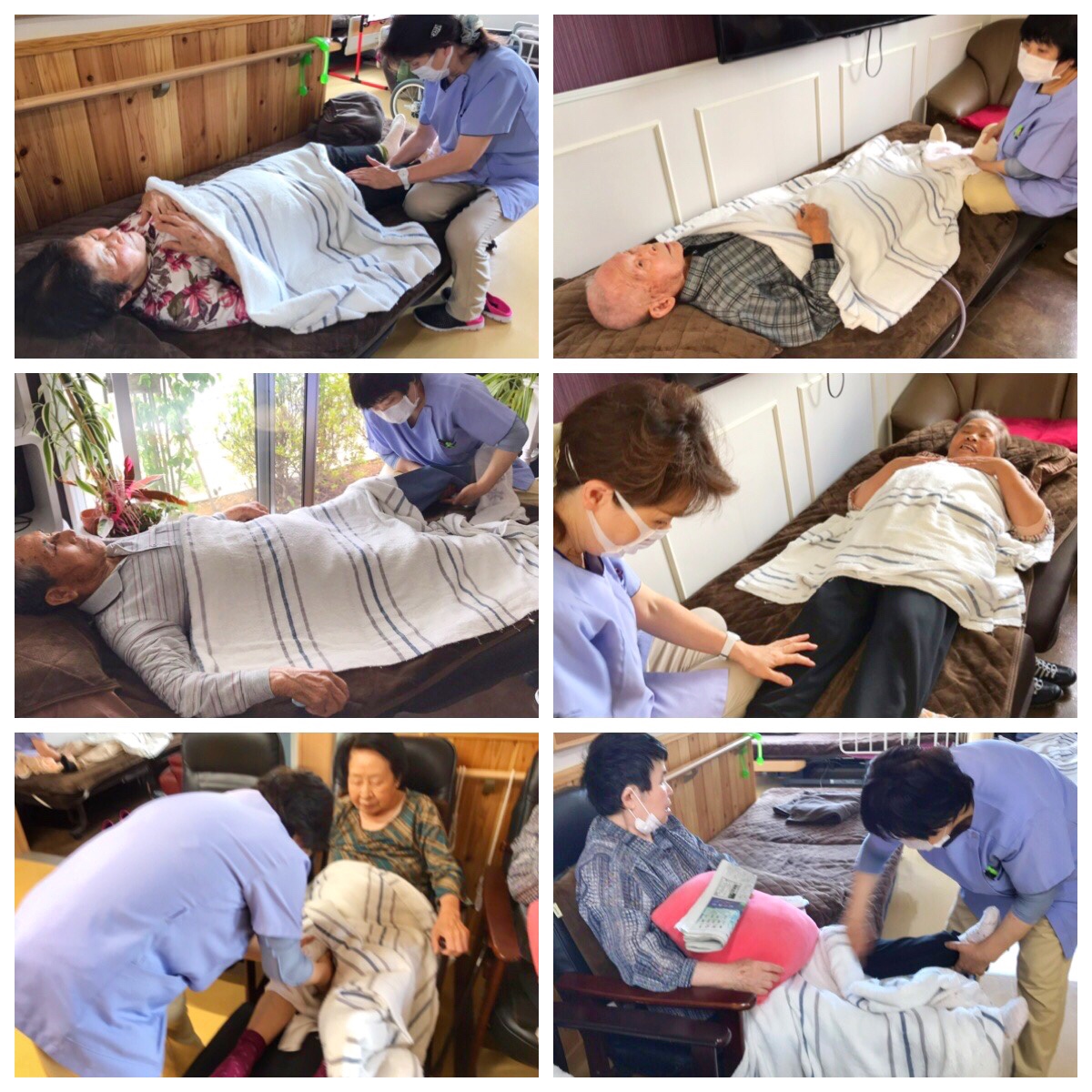 ※機能訓練前に硬直した筋肉をほぐす為、当センターではマッサージをおこなっております。機械では味わえない感触がとても大好評です。『やっぱ人の手だよね』とのお声が上がっております。