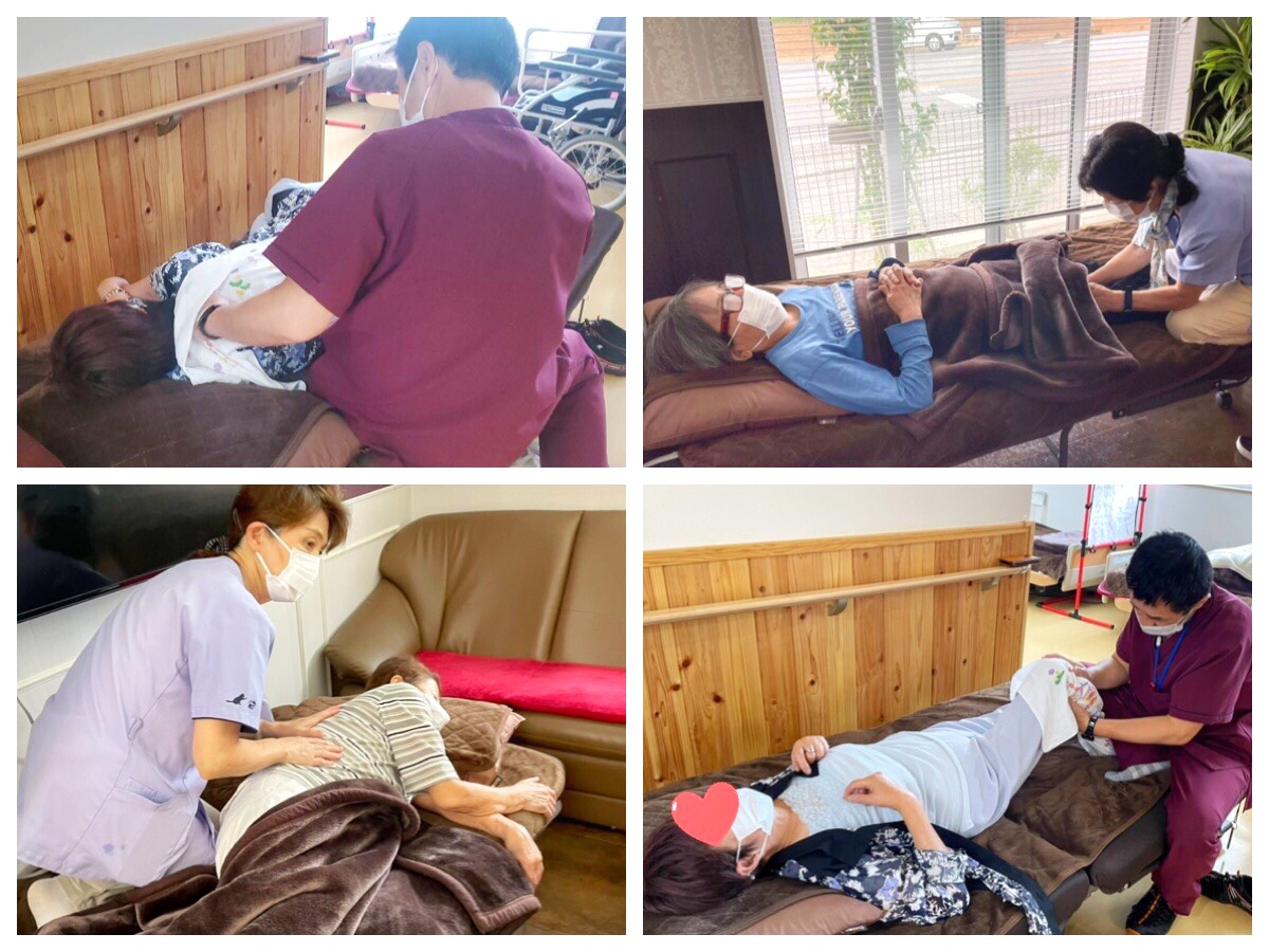 ※機能訓練前に硬直した筋肉をほぐす為、当センターではマッサージをおこなっております。機械では味わえない感触がとても大好評です。『やっぱ人の手だよね』とのお声が上がっております。
