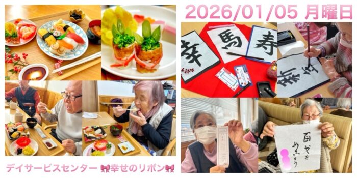 2026 年 1 月 5 日 1件の投稿 202601/05 お寿司&ミニおせち御膳の日と書き初め大会 新年明けましておめでとうございます。 本日より ブログ再開と 通常営業が始まりました。 本年も幸せのリボンを どうぞ宜しくお願いします。 …READPOST 月曜日の日記 | 特別昼食の日 | レクリエーション | 全ての日記anamizu