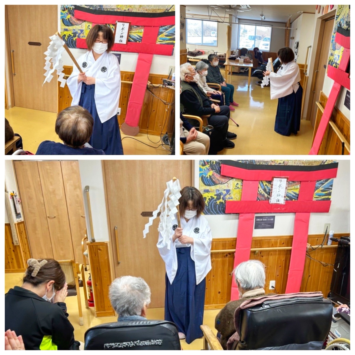 巫女の格好をしたスタッフがリボン神社でご祈祷をして