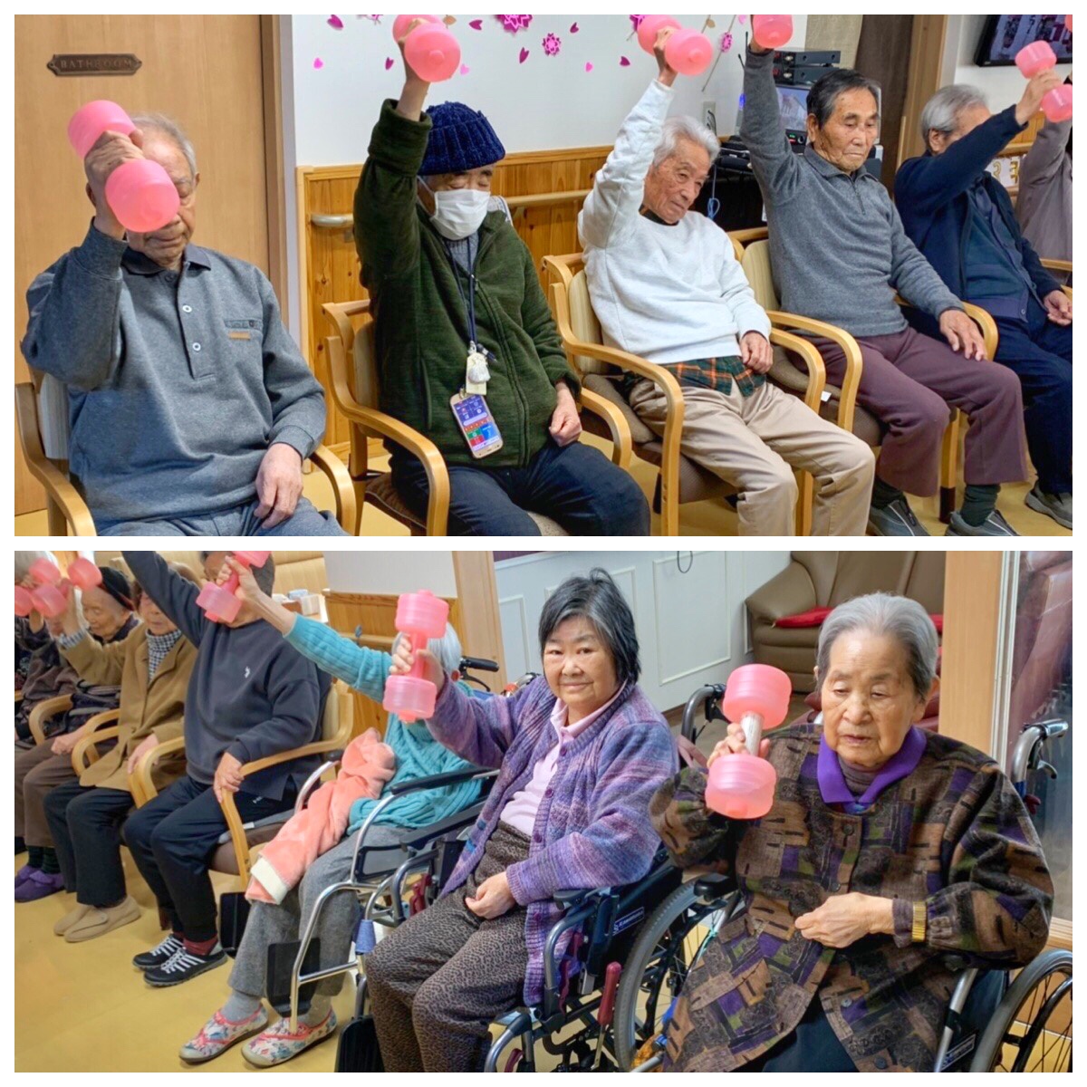 ※オモリを持って 歌いながら!楽しみながら!低負荷高反復でおこないます。歌いながらおこなうことで呼吸器訓練にもなり、且つ、楽しみながら効率効果的なリハビリがおこなえます。