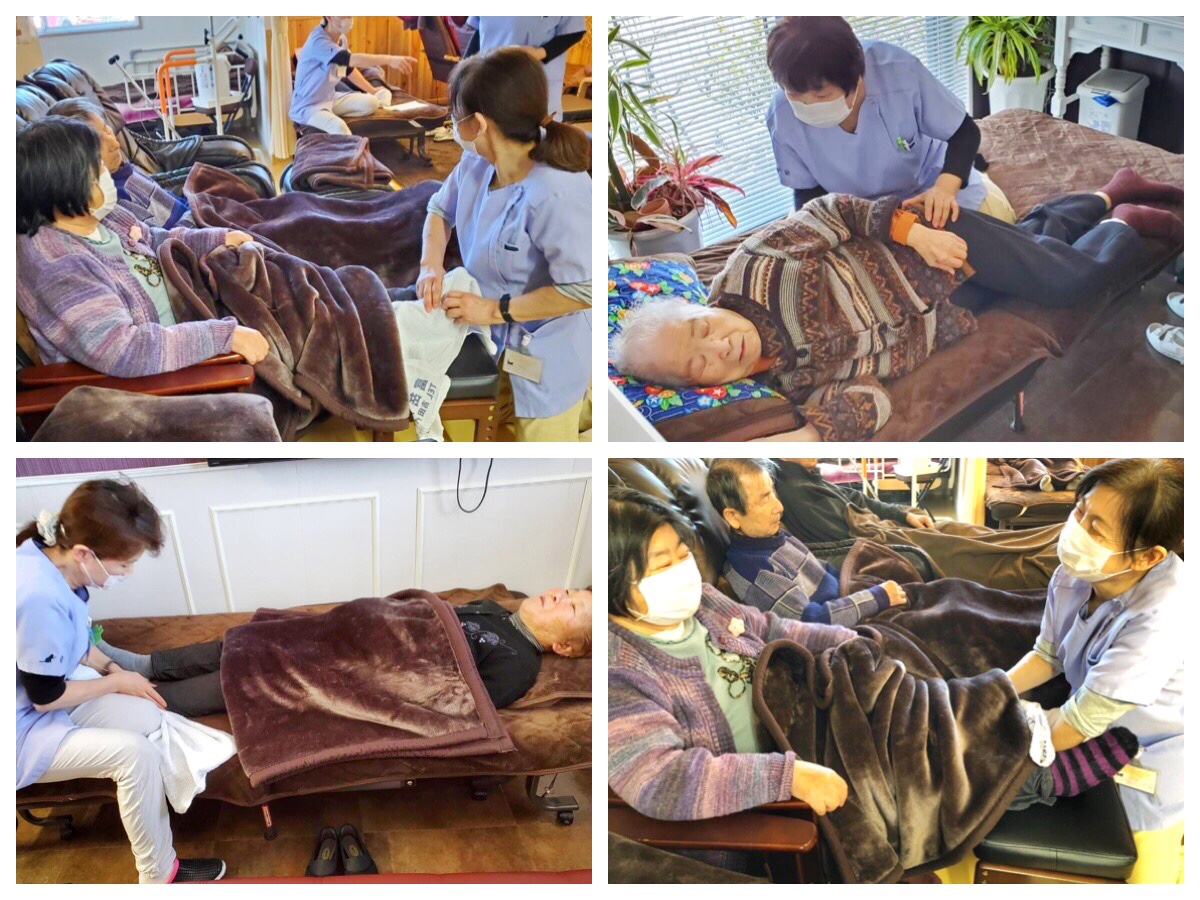 ※機能訓練前に硬直した筋肉をほぐす為、当センターではマッサージをおこなっております。機械では味わえない感触がとても大好評です。『やっぱ人の手だよね』とのお声が上がっております。