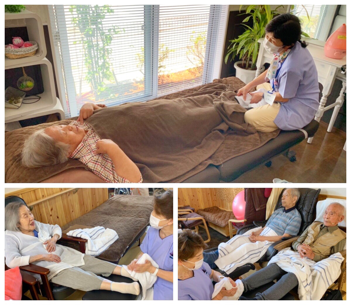 ※機能訓練前に硬直した筋肉をほぐす為、当センターではマッサージをおこなっております。機械では味わえない感触がとても大好評です。『やっぱ人の手だよね』とのお声が上がっております。