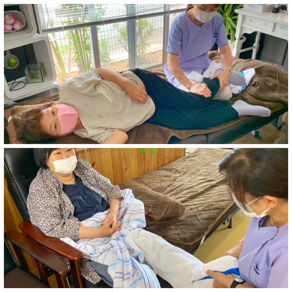 ※機能訓練前に硬直した筋肉をほぐす為、当センターではマッサージをおこなっております。機械では味わえない感触がとても大好評です。『やっぱ人の手だよね』とのお声が上がっております。