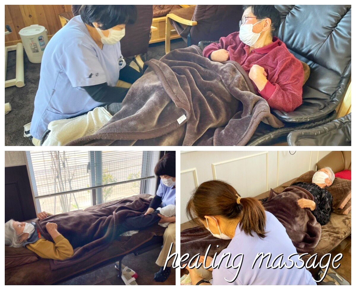 ※機能訓練前に硬直した筋肉をほぐす為、当センターではマッサージをおこなっております。機械では味わえない感触がとても大好評です。『やっぱ人の手だよね』とのお声が上がっております。